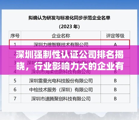深圳,作为中国的经济特区,一直以来都是科技创新和企业发展的热土,随着市场的发展和监管政策的加强,强制性认证在各行各业中扮演着越来越重要的角色,本文将探讨深圳地区强制性认证公司的排名及其行业影响力,为读者提供有价值的参考信息。