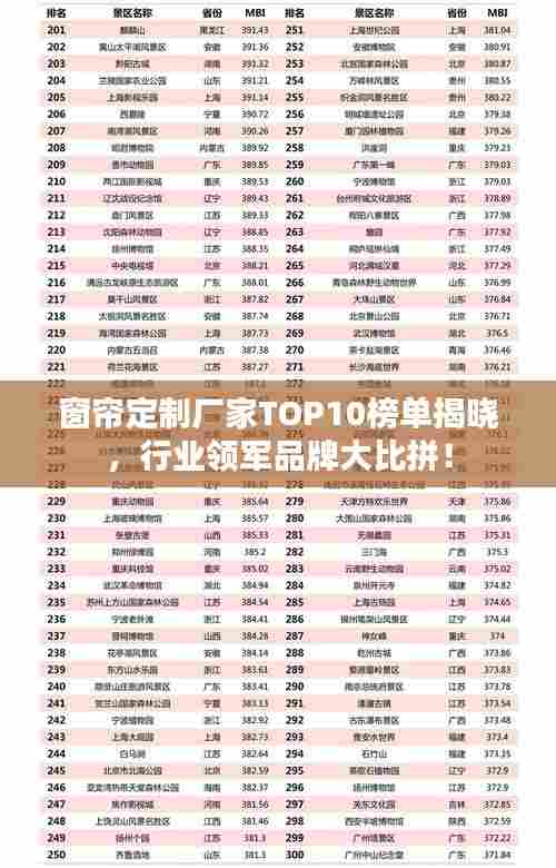 七至十名分别由DDD窗帘定制厂家、EEE窗帘定制工厂、FFF窗帘定制企业以及GGG窗帘定制品牌占据,这些厂家和品牌同样在窗帘定制领域拥有较高的知名度和影响力,为消费者提供优质的定制服务。