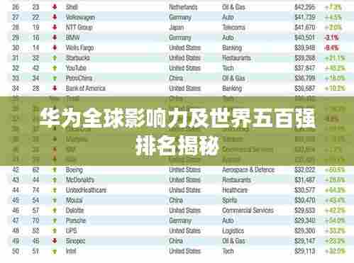 华为在世界五百强中的排名及其全球影响力是其实力、竞争力、创新力和市场表现的体现,华为的发展历程充满了拼搏与创新,其全球影响力不仅体现在其产品和服务上,也体现在其技术实力和创新能力上,面对未来,华为将继续坚持创新、开放合作,为全球用户提供更好的产品和服务。