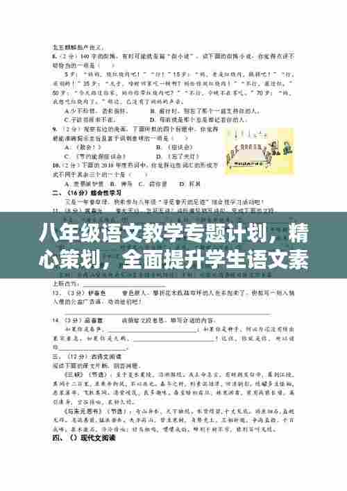 八年级是中学教育的重要阶段,语文教学作为基础教育的重要组成部分,对于学生综合素质的提升具有重要意义,为此,制定一份八年级语文教学专题计划,旨在提高语文教学质量,培养学生语文综合素养。