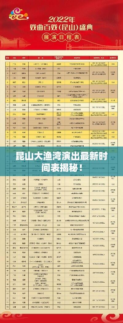 随着旅游业的繁荣发展,越来越多的人选择前往各地旅游观光,体验不同的文化和风情,作为江苏省的一个重要城市,昆山以其独特的魅力和丰富的旅游资源吸引了众多游客前来,昆山大渔湾作为一处著名的旅游景点,更是备受瞩目,本文将为大家介绍昆山大渔湾演出时间表的最新动态,帮助游客更好地安排行程。