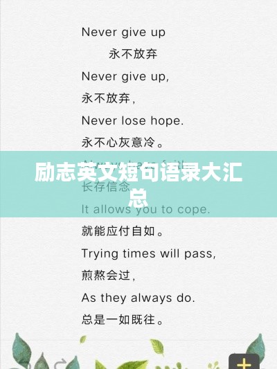 这些励志英文短句,每一句都蕴含着深刻的哲理,它们告诉我们,成功并非一蹴而就,而是需要付出努力、坚持不懈,面对挑战和困难时,我们要勇敢前行,永不言弃,这些短句提醒我们珍惜当下,积极面对生活,勇敢追求梦想。
