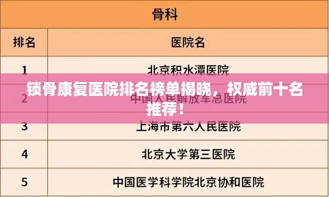 为全国锁骨康复医院排名前十名,这些医院在锁骨康复领域拥有丰富的经验和先进的设备,拥有专业的医疗团队,能够为患者提供个性化的康复方案,患者在选择康复医院时,可以根据自己的情况和需求选择合适的医院进行治疗,患者在康复期间还需注意饮食、锻炼等方面的调整,积极配合医生的治疗和康复训练,以便尽快恢复健康。