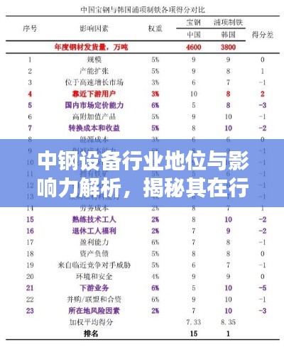 随着工业领域的快速发展,中钢设备公司在国内外市场上逐渐崭露头角,其在行业中的排名及影响力逐渐受到广泛关注,本文将从多个角度探讨中钢设备公司在行业中的排名及其相关因素。