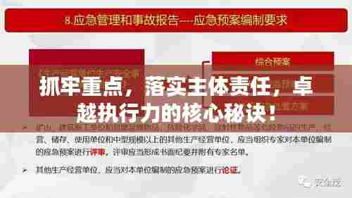 在当今社会,竞争日益激烈,成功与否往往取决于我们能否抓牢重点、落实主体责任,执行力是组织和个人实现目标的关键能力,而抓牢重点和落实主体责任则是执行力的核心要素,只有深刻认识到这两点的重要性,才能在实践中不断提升自身执行力,推动组织发展。