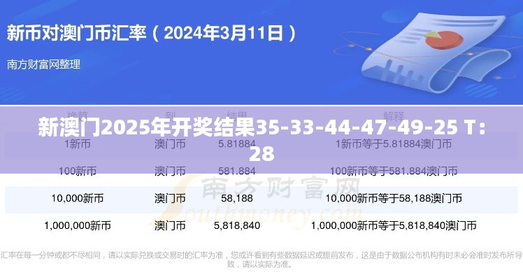 根据澳门彩票的发行和开奖规则,本次开奖结果如下:前六位数字分别为35、33、44、47、49、25,特别号码(T)为28。澳门彩票开奖结果均通过严格的程序,确保每位参与者的合法权益,同时保障开奖过程的透明度和公正性。