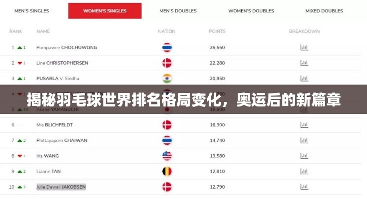 随着奥运会的圆满落幕,全球羽毛球爱好者的目光纷纷聚焦于运动员们的世界排名,奥运会无疑是检验运动员实力和状态的最高舞台,每一场胜利都足以改变世界排名格局,本文将为您揭示奥运会后羽毛球的世界排名情况。